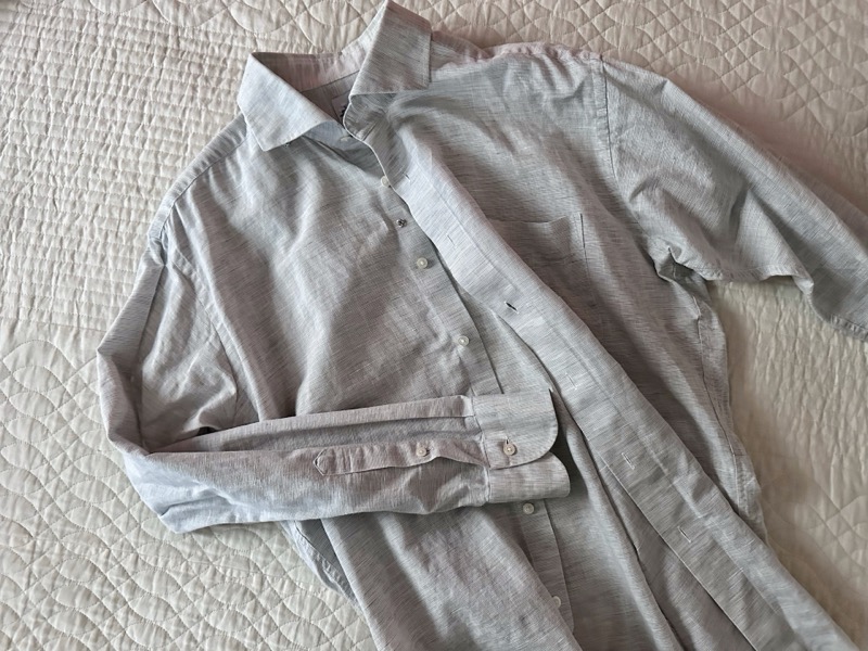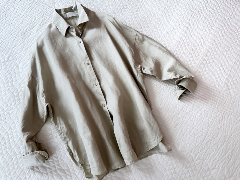 リネン(亜麻)素材のシャツは、タックインスタイルと相性が良い素材のひとつです。リネンの繊維はコットンに比べて中空構造が発達しており、通気性に優れるうえ、独特の「落ち感(ドレープ性)」があります。この落ち感が、タックインしたときに自然なシワ感を生み、計算されたリラックス感を演出してくれます。