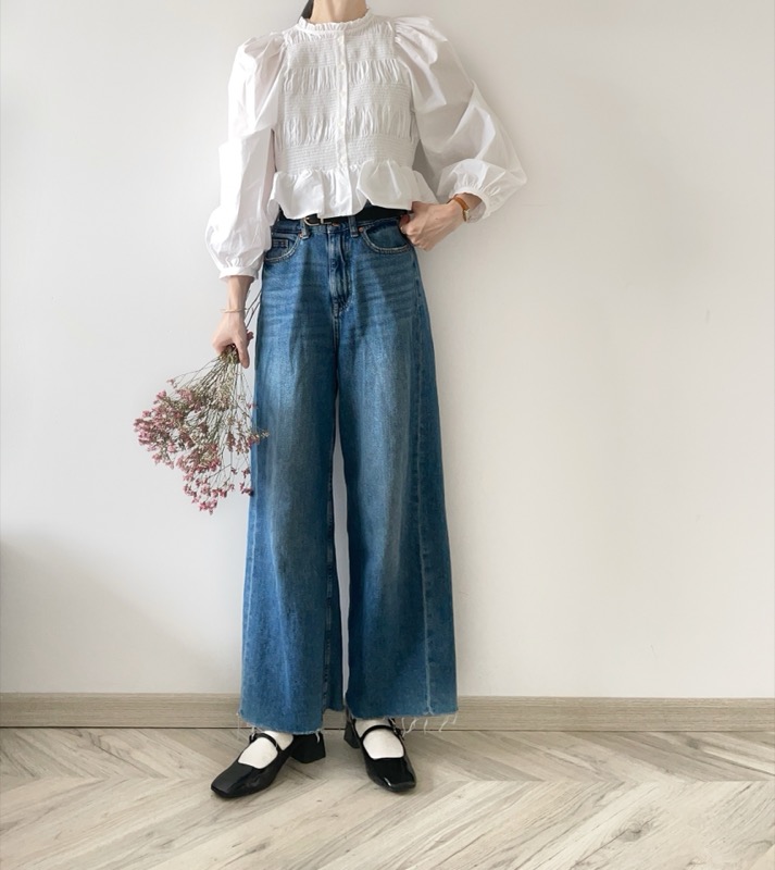 パンツはスカートに比べて、座る・しゃがむ・脚を上げるといった動作の幅が大きいため、ゴムの長さにはやや余裕を持たせるのが基本です。倍率は0.90〜0.95倍が目安で、特にワイドパンツやガウチョパンツのようにゆったりしたシルエットのものは0.93〜0.95倍と緩めに設定すると、座ったときにお腹への圧迫感が軽減されます。